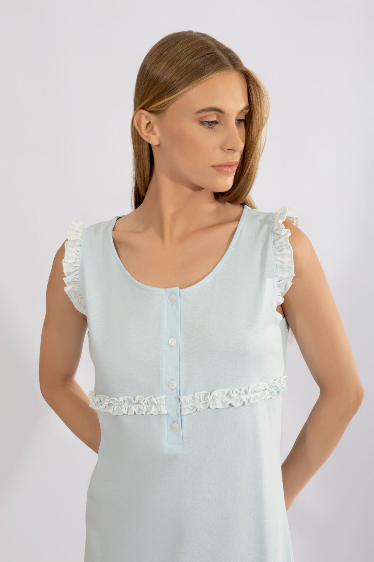 Νυχτικό μονόχρωμο Αμάνικο με πατιλέτα και καρώ detail cotton modal – 310811 ciel